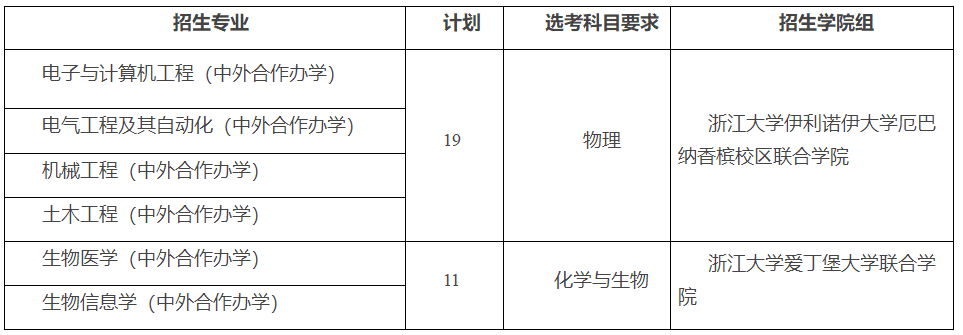 注1:浙江大学伊利诺伊大学厄巴纳香槟校区联合学院招生的4个专业共用19个招生计划,浙江大学爱丁堡大学联合学院招生的2个专业共用11个招生计划。